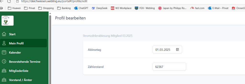 Die Zählerablesung erledigt Ihr bitte im März jeden Jahres und übermittelt ihn an die Stromgesellschaft. Damit der bürokratische Aufwand minimiert wird, bitte wir Euch den Zählertand direkt im Mitgliederportal unter Profil einzutragen.